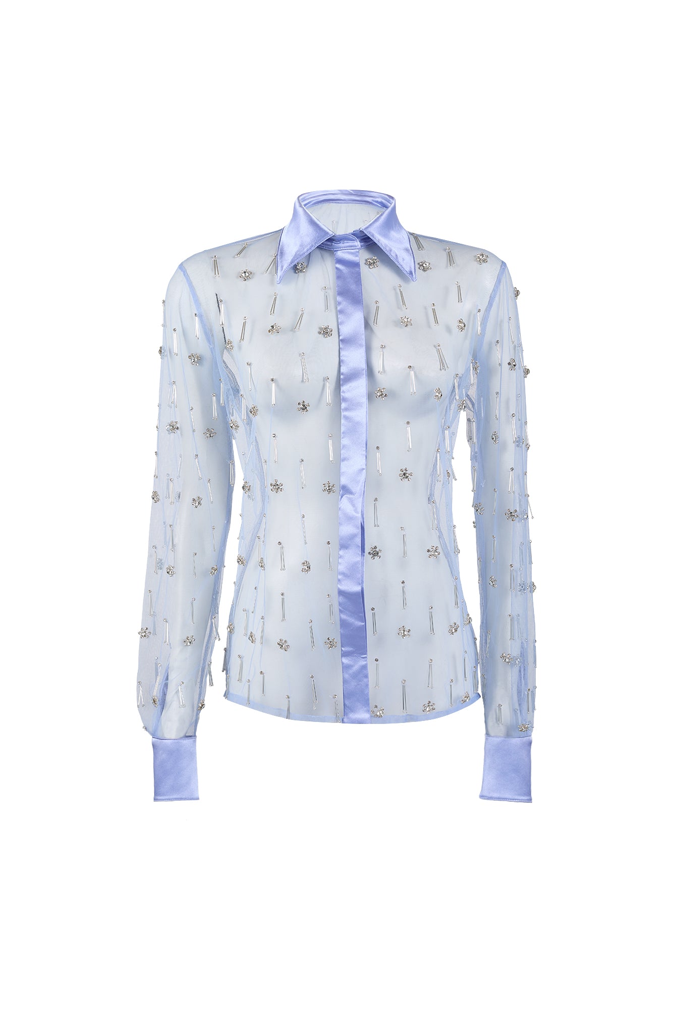 Periwinkle blouse with satin collar and cuffs, finished with scattered crystal embellishments.