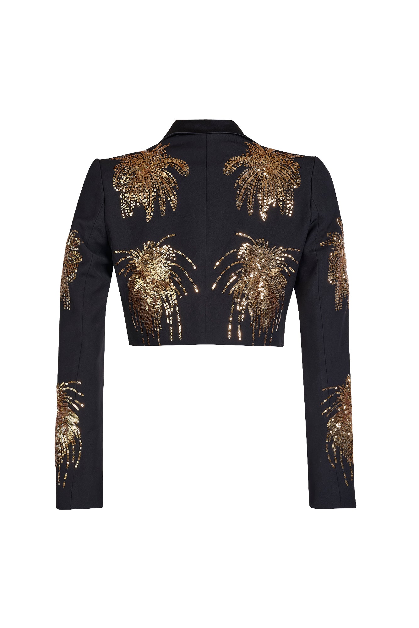 Black cropped jacket with gold sequin firework embellishments.