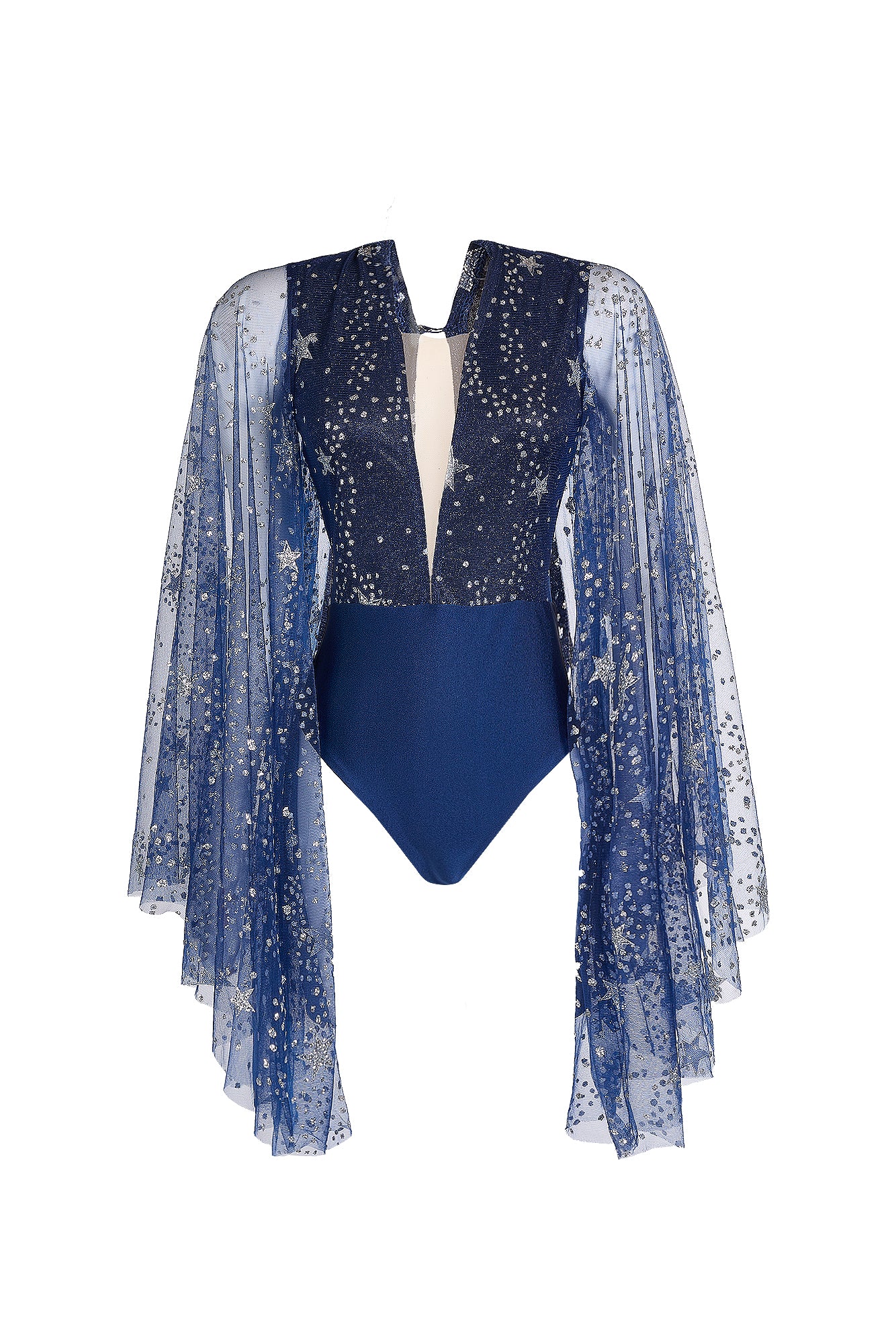 Blue mesh bodysuit with silver star embellishments and cascading cape sleeves.
