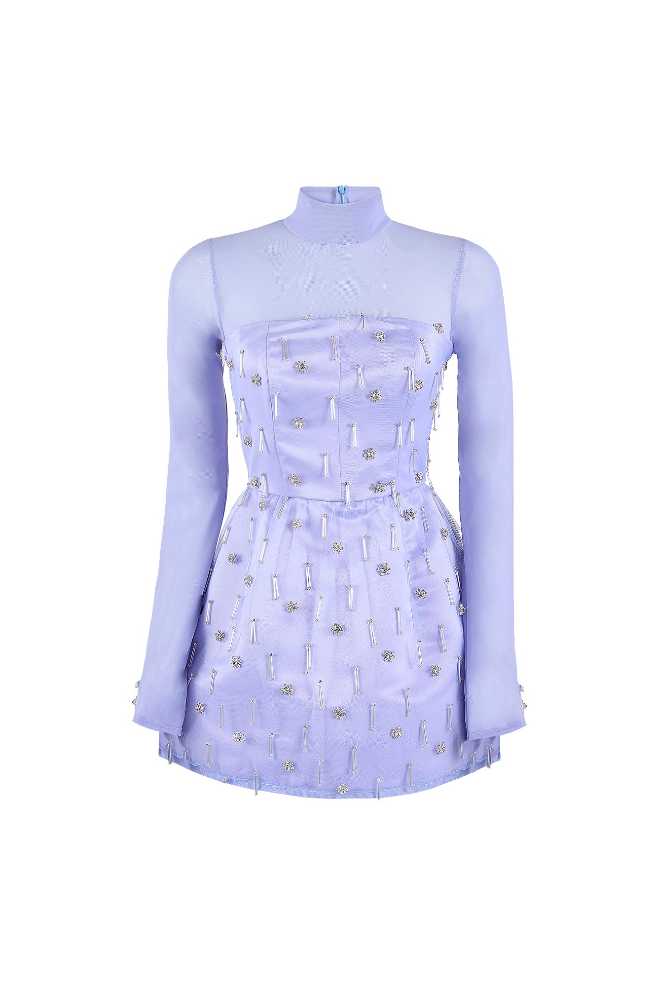 Periwinkle mini dress with sheer long sleeves and crystal embroidery on bodice and skirt.