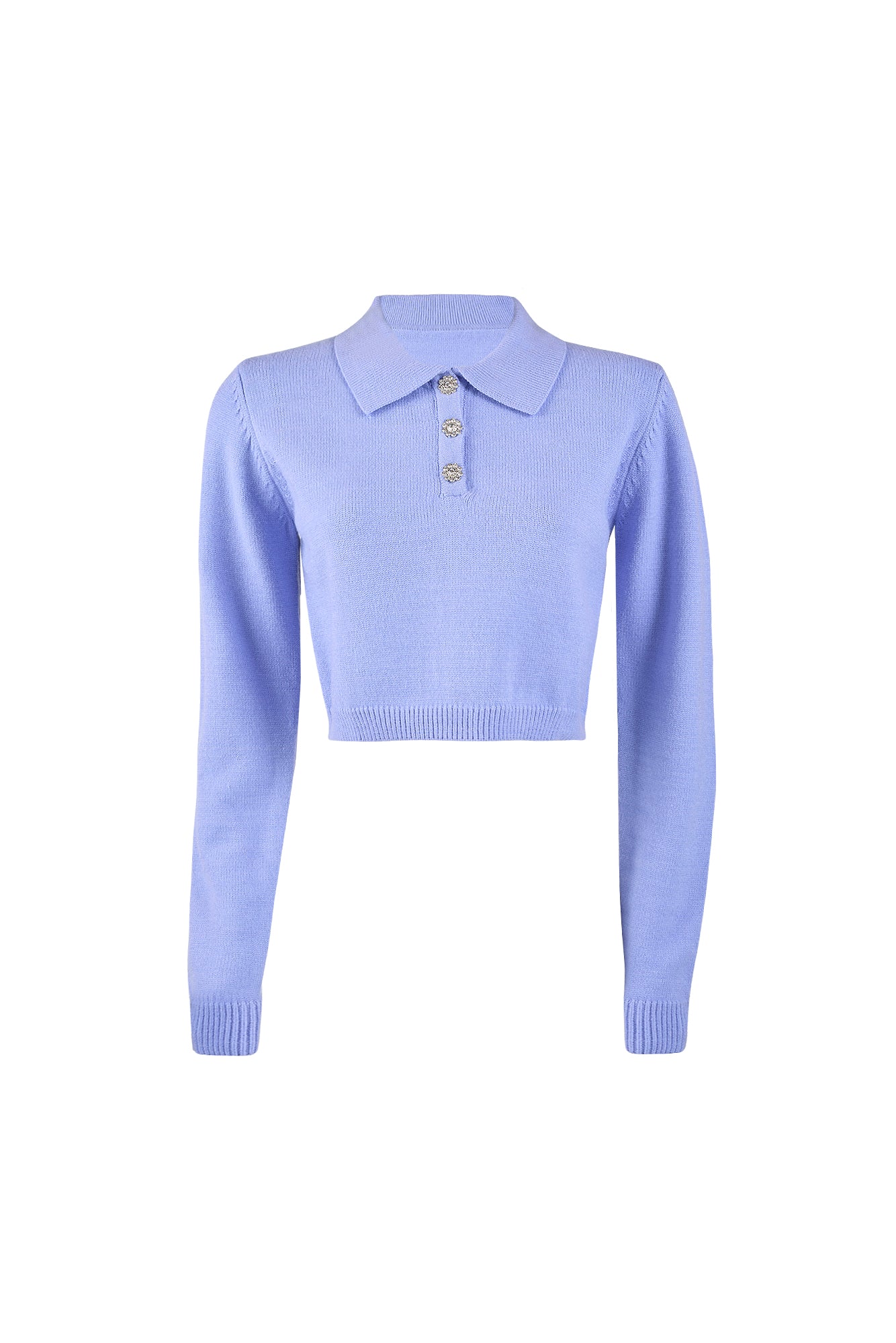 Periwinkle knit cropped polo with long sleeves and crystal buttons.